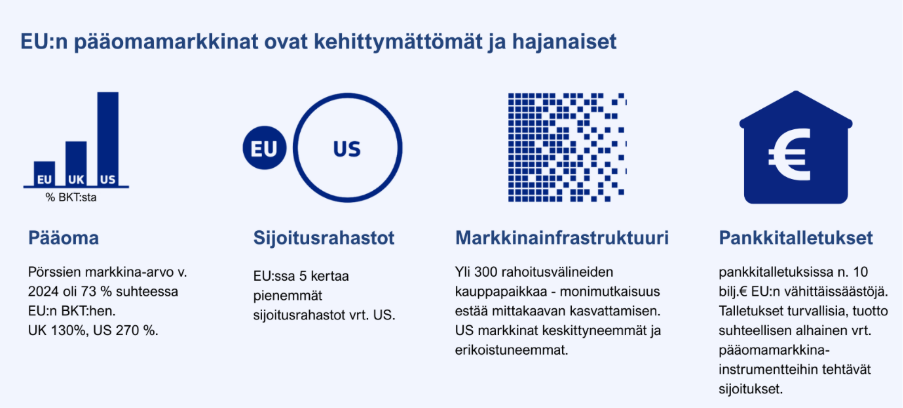 Yhdelläkään yksittäisellä EU:n jäsenvaltiolla ei ole riittävän suurta taloutta tai rahoitusjärjestelmää ollakseen yksin merkittävä maailmanlaajuinen toimija. EU haluaakin luoda jäsenvaltioiden välille aidosti yhdentyneen markkinan, tavoitteenaan saavuttaa positiivinen kierre: pääomamarkkinat tarjoavaisivat tehokkaammin tuloja kansalaisille, jotka puolestaan päättäisivät investoida, ja vastaisivat näin EU:n yritysten rahoitustarpeisiin riippumatta siitä, missä jäsenvaltiossa ne sijaitsisivat.